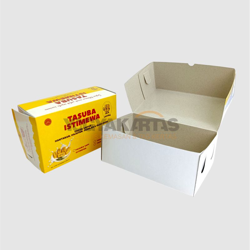 Dus Tasuba (Tahu Susu Bakso) – PT. Yogyakartas Mega Grafika memproduksi dus tasuba dengan berbagai bahan mulai dari Ivory, Duplex, dan Kraft Coklat. Yogyakartas juga melayani pembelian dari jumlah kecil sampai partai besar .